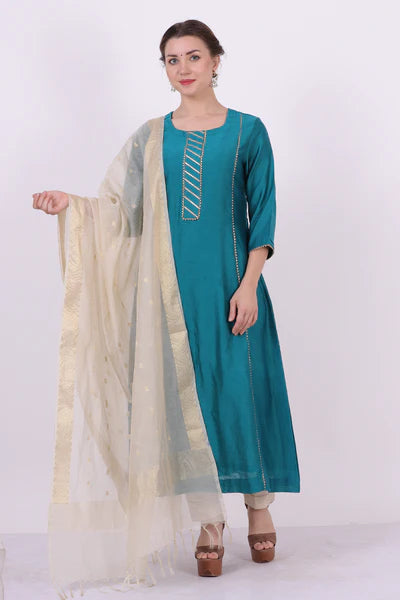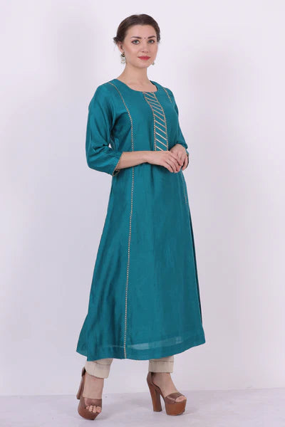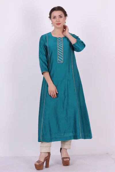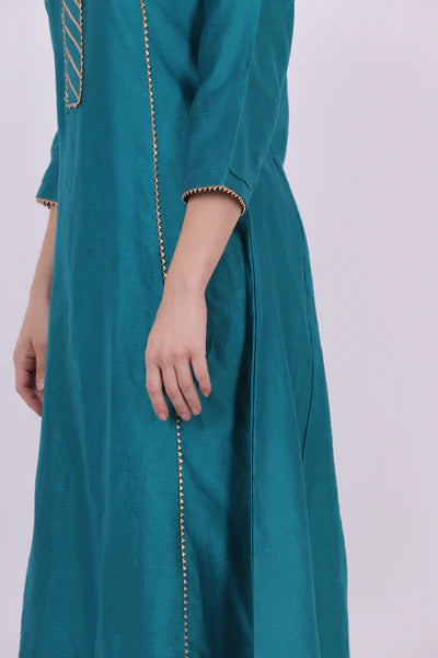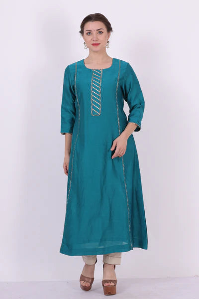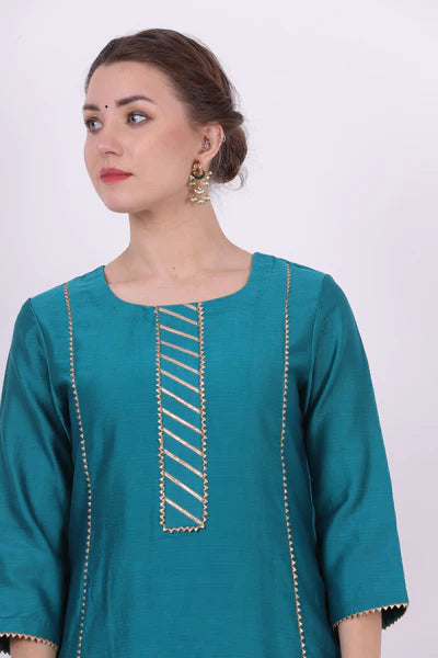 Introducing the Kaavya: a pure Chanderi silk tunic crafted with meticulous artistry and finesse. Featuring intricate gota and keengri lacework on the neckline and sleeves, this versatile piece pairs seamlessly with bottoms and dupattas in any color of your choice - delivering a contemporary, chic look perfect for any festival.