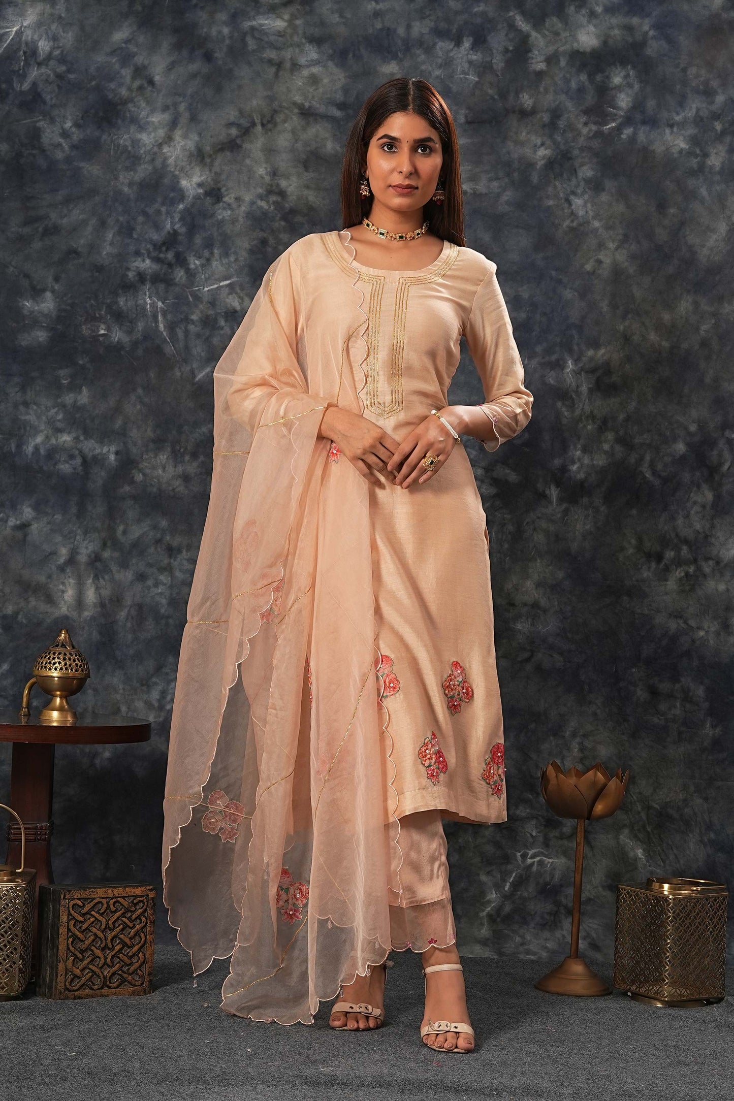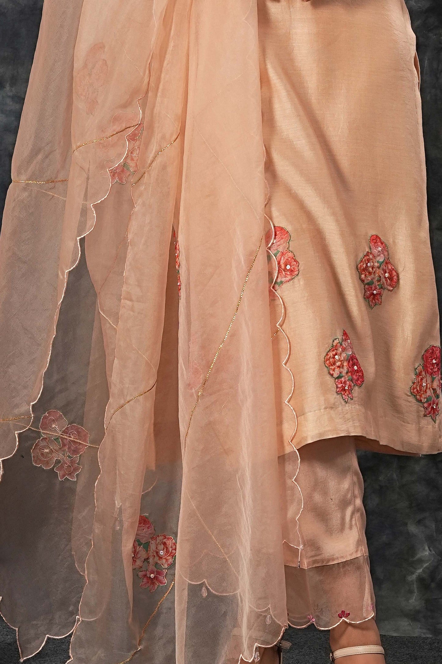 This suit set features a delicate floral applique work over the entire piece, complemented by beautiful scalped organza lace on the sleeves and bottom, as well as a scalped dupatta and tassels to bring the look together. The perfect choice for any special occasion.