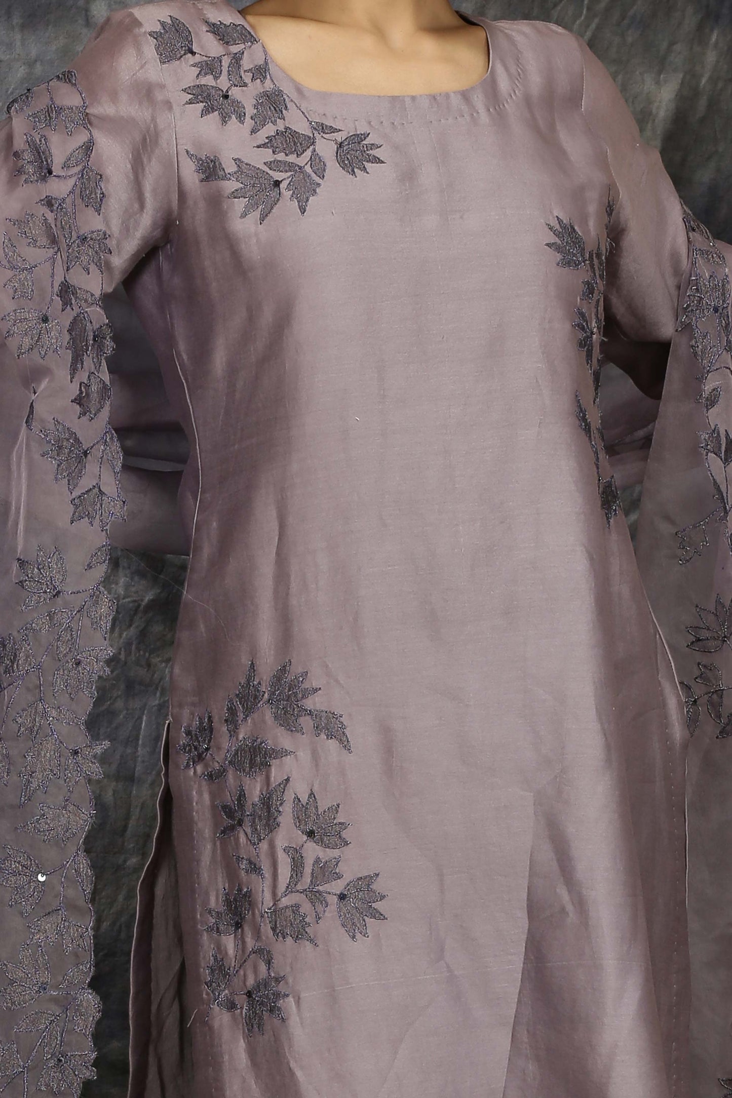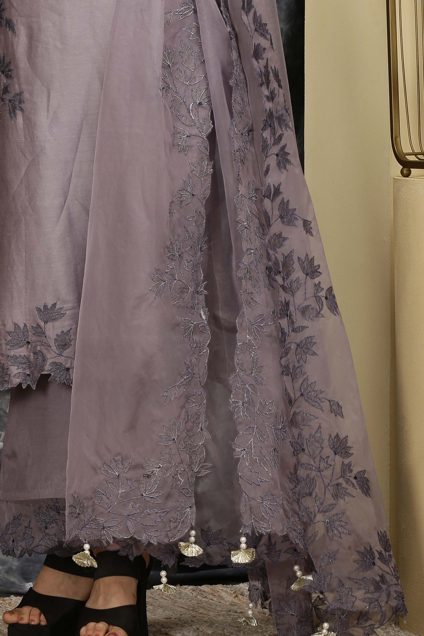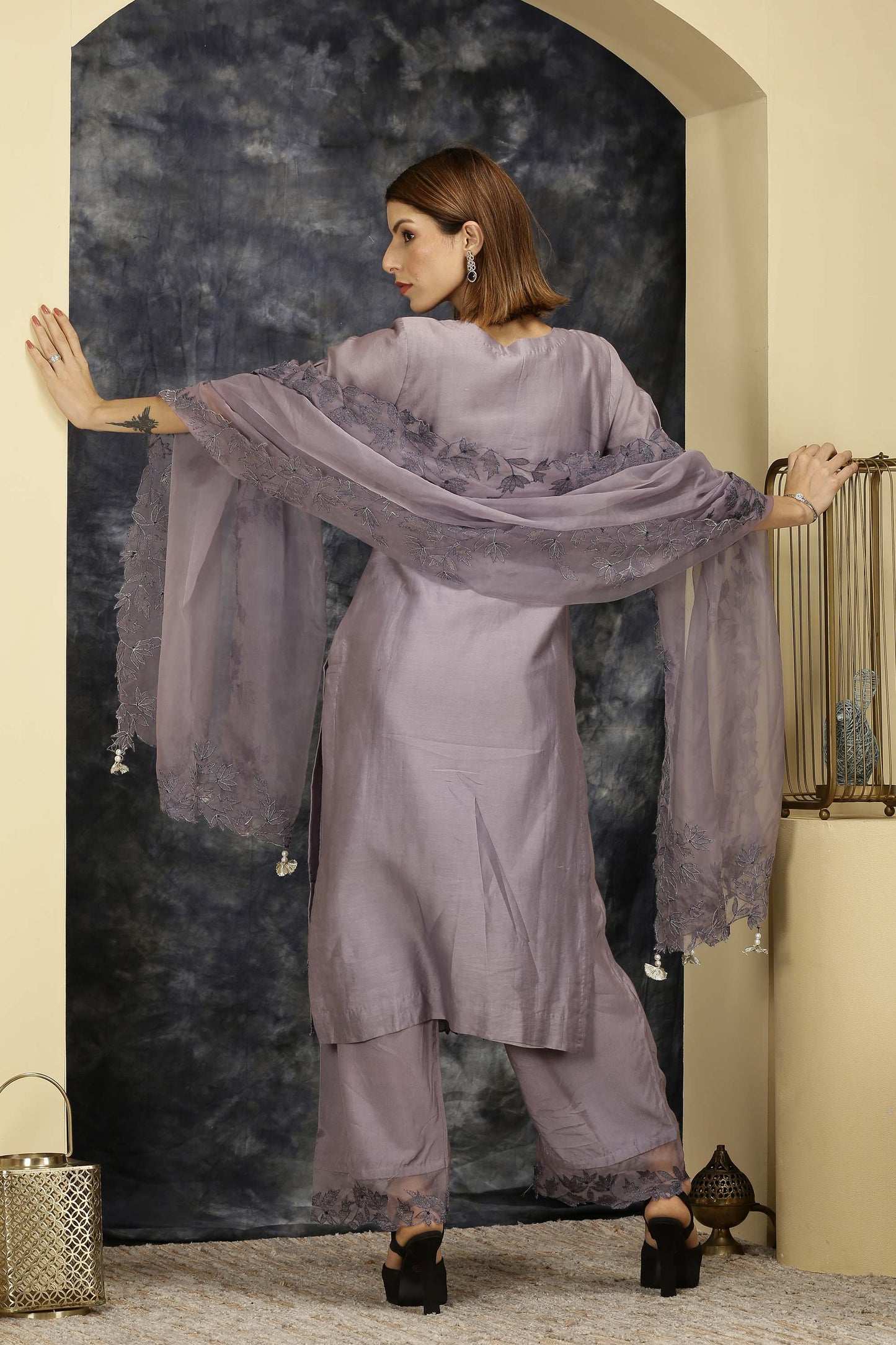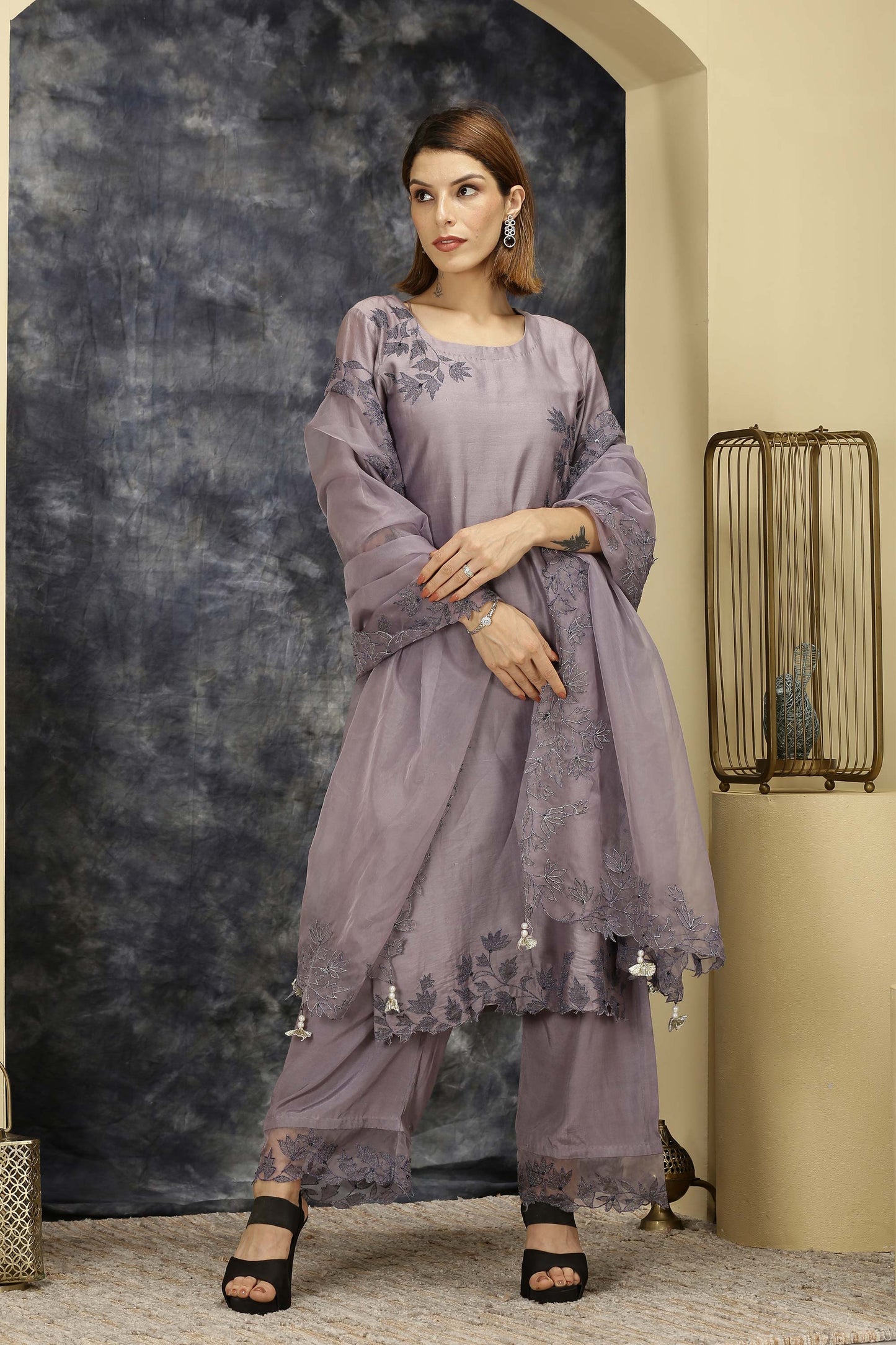 Experience a timeless look with the Rajdulari suit set. Each piece is crafted with delicate applique work and scalped organza lace on the sleeves and bottom for a chic, sophisticated touch. The scalped dupatta and tassels complete the ensemble, creating a luxurious, artfully-made garment with an iconic appeal.