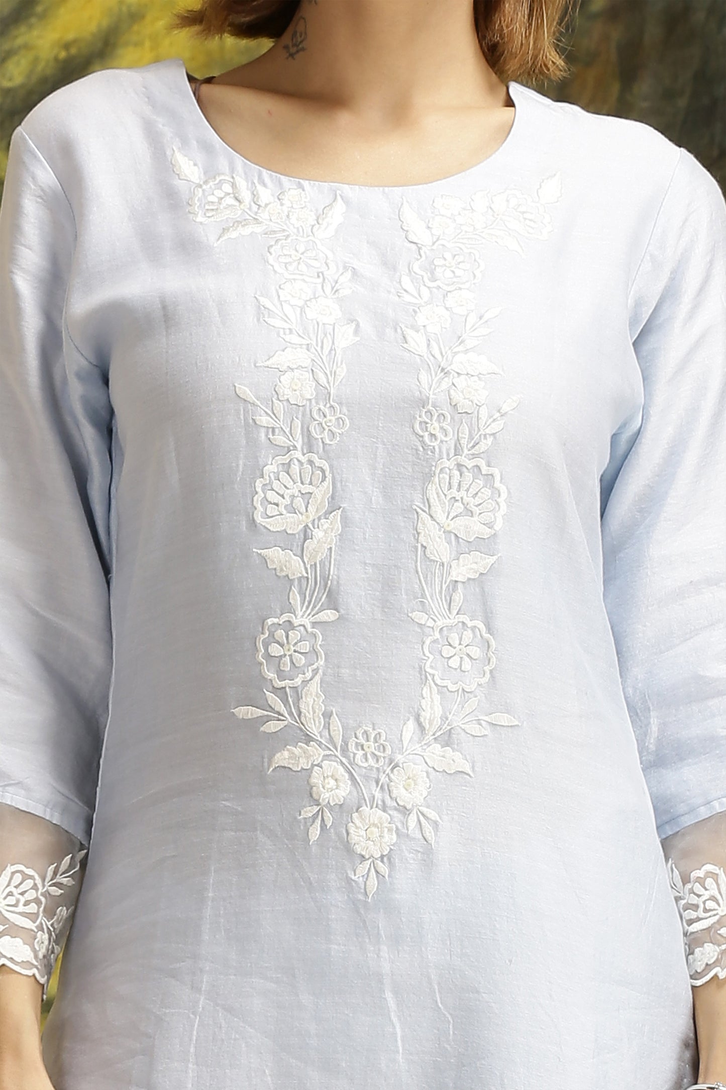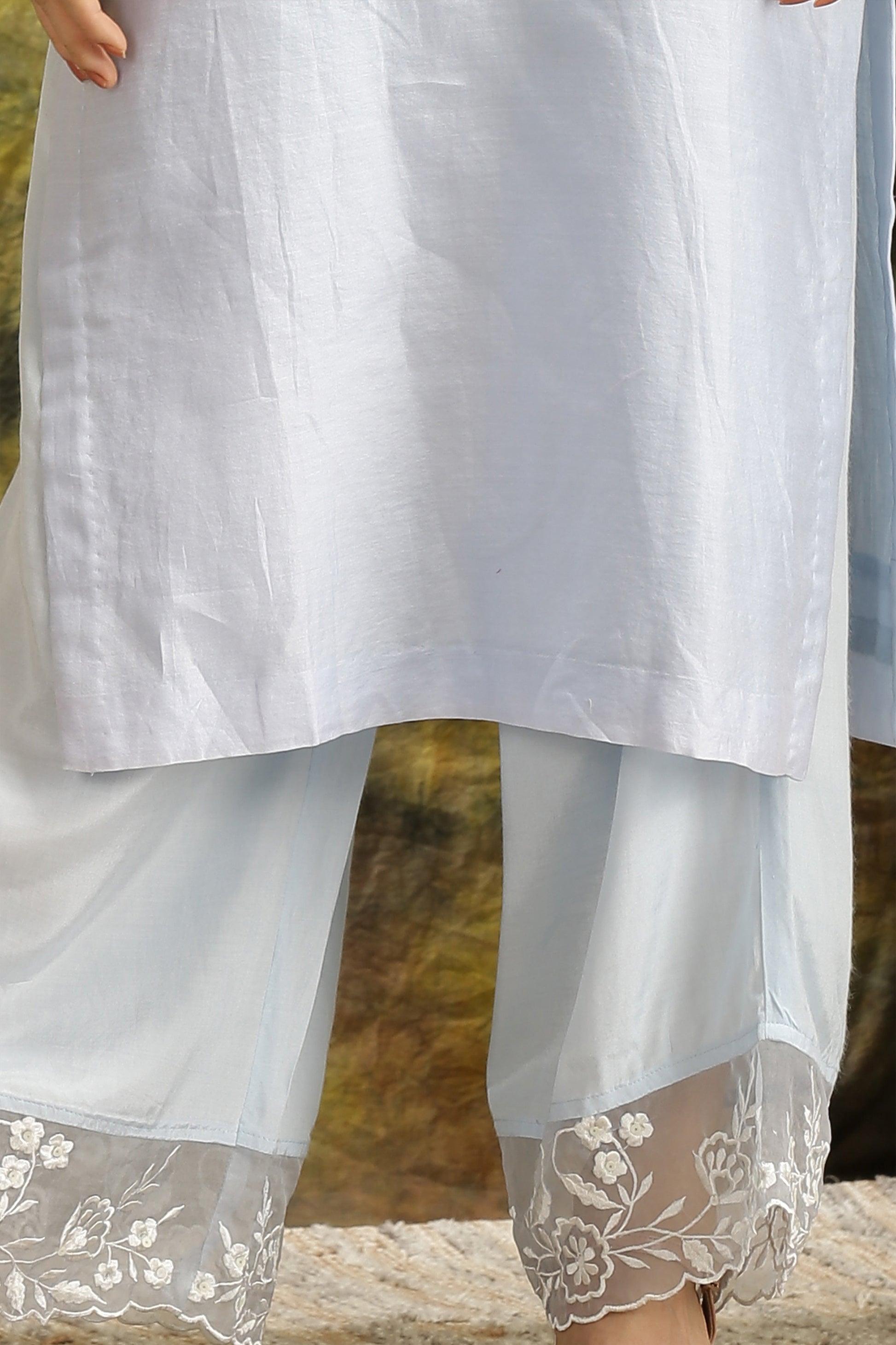 The ethereal white embroidery on this Indian ethnic wear symbolises purity and auspiciousness , giving it luxurious appearance.